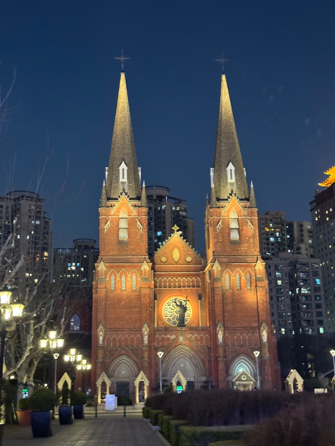 暮色渐沉,深蓝的天幕下,这座红砖教堂静静矗立,像一封写给时光的信。两座尖塔刺破夜空,塔顶的十字架在微光里沉默,仿佛在倾听城市的心跳。
