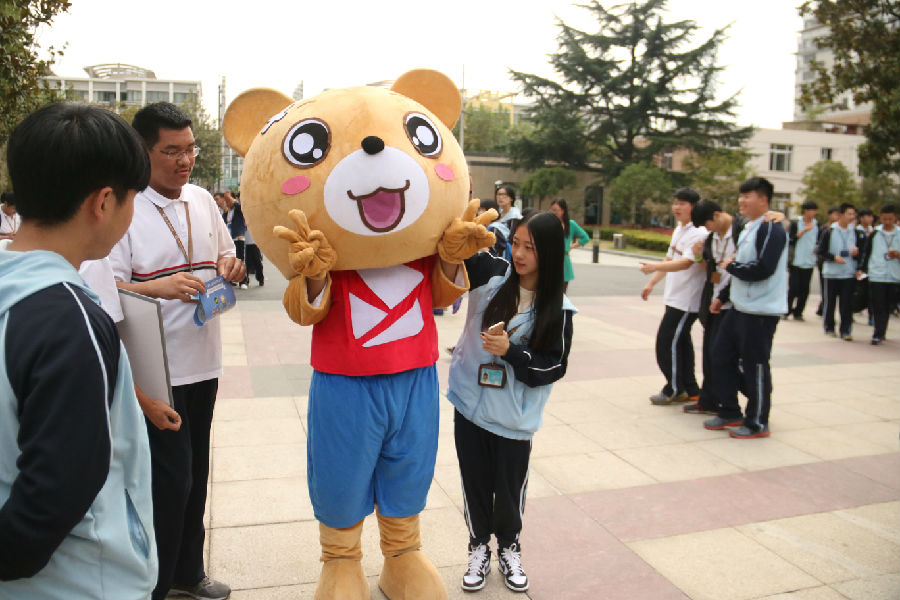 同学们争相与可爱的易班熊合影留念