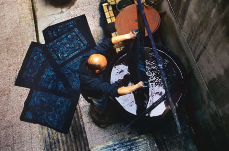 在三四十年前,手工染布是许多农村妇女的必修课,现在已经很难见到。染布的主要原料是山地产的一种蓝靛的植物,它经浸泡发酵,加进稻草灰与生石灰,就是染布的上好染料了。染布的流程比较复杂,白色的素布,在一定的蓝靛染缸中经过几次提染,再蒸煮定色,晾干漂洗。